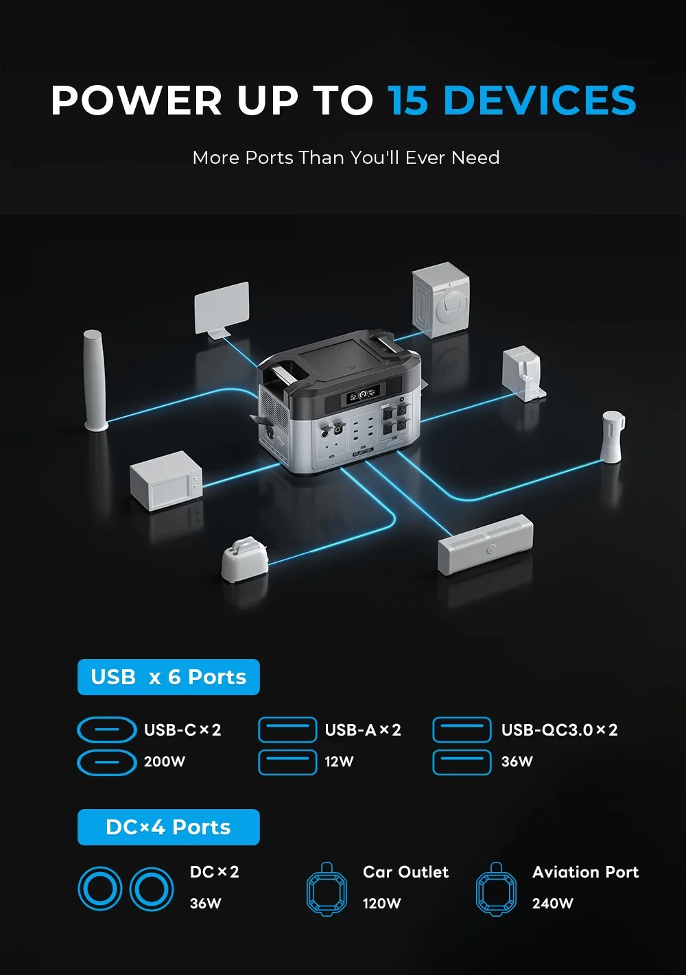 - Solar Input: Max.1000W(MPPT), 12-120V/15A, 1*XT60 Port