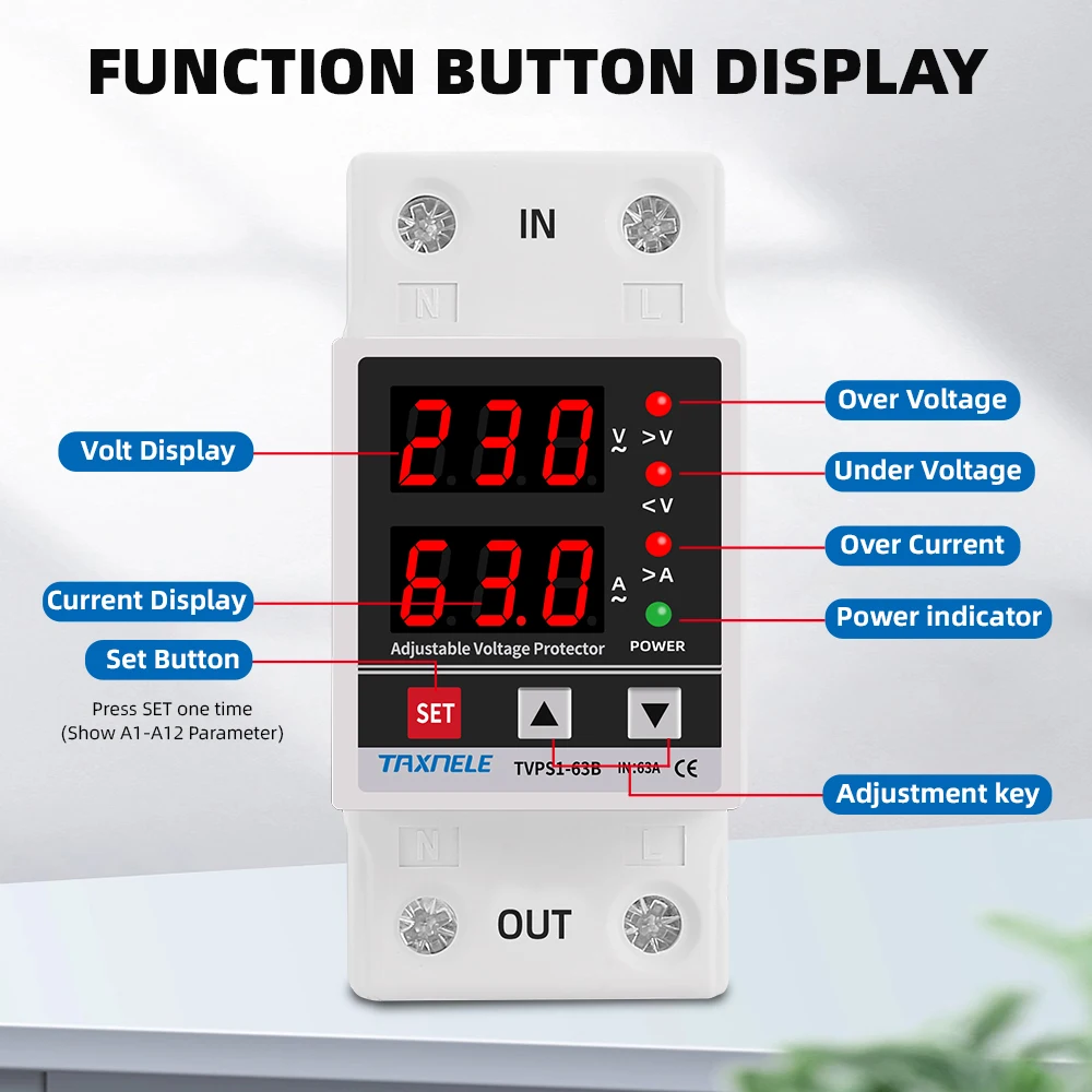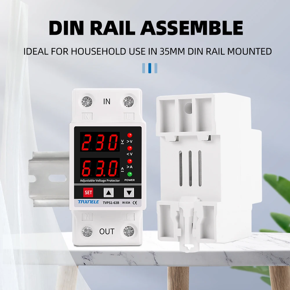Dual Display 40A 63A 230V Din Rail Adjustable digital Over Under Voltage Relay Surge Protector Limit Over Current Protection