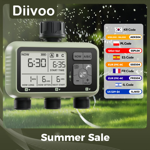 Diivoo Garden Water Timer 3 Zone Programmable Automatic Irrigation Timer with Rain Delay Manual/Auto Mode Watering for Lawn Yard